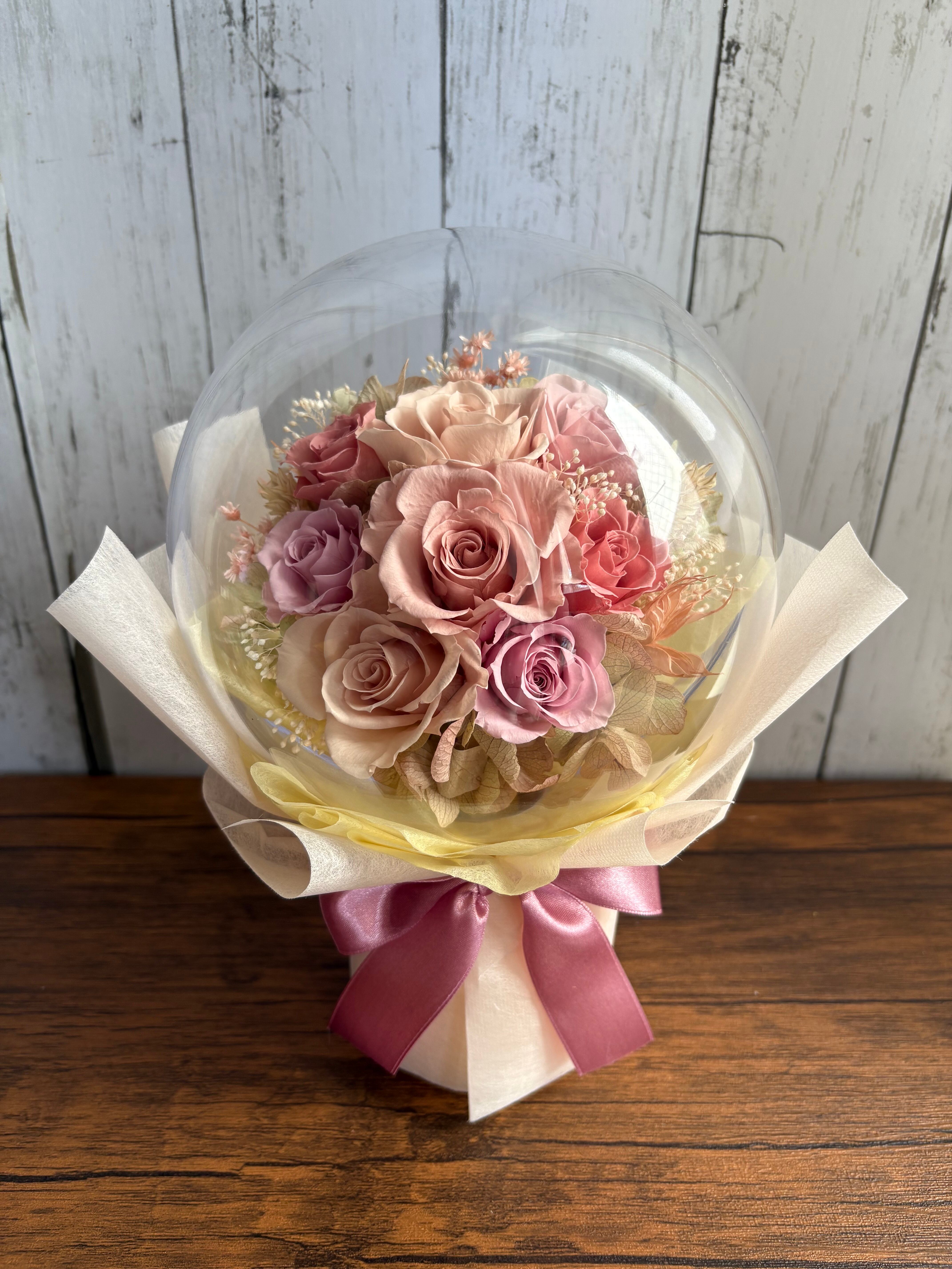 ふんわりとした透明感が魅力のアクリルバルーンに、くすみカラーでまとめたプリザーブドフラワーをたっぷり詰め込みました。